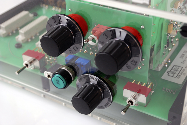 DNM Controls - the photograph shows the classic DNM arrangement of independent volume controls and rotary selector switch. The volume potentiometers and the switches are all selected to maintain a constant spacing between the signal plus/minus controlling the impedance in all parts of the circuit. The green 2 button lights up when it is pressed to the "out position" to mute the preamplifier. When the pre-amplifier being used all lights are off to minimise electrical noise. The toggle switch on the left selects between two sets of RIAA amplifiers when fitted. The one on the right selects the type of tape output signal, either fixed line level or volume controlled main output level.